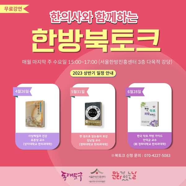 책을 저술하신 한의사 선생님이 직접 강연을 무료로 들을 수 보니 더 재밌고, 더 유익한 서울한방진흥센터의 인기 프로그램이에요.