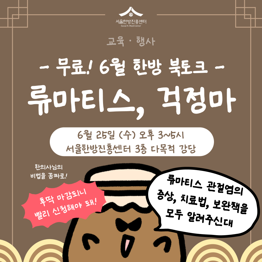 관절 건강에 관심 있는 시민 여러분을 위해 전통 한의학 기반의 북토크를 준비하였습니다. 이번 북토크에서는 한의사 선생님을 모시고 류마티스 관절염의 치료법과 생활 속 보완책에 대해 알아보는 시간을 갖습니다.