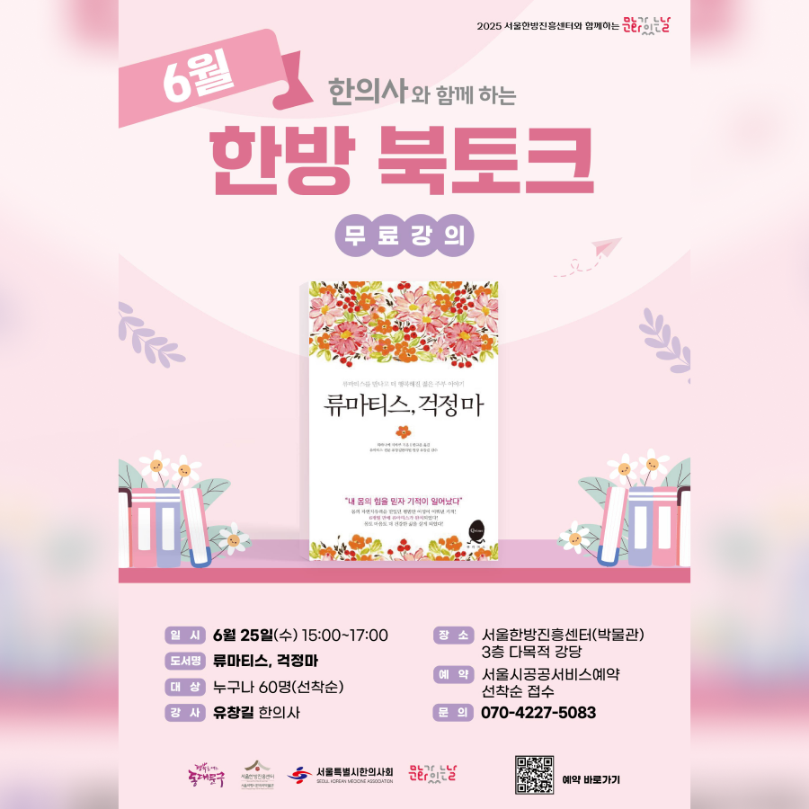? 일시: 2025년 6월 25일(수) 오후 3시 ~ 5시 ? 장소: 서울한방진흥센터 3층 다목적 강당 ? 신청 방법: ‘서울시공공서비스예약’ 홈페이지를 통한 선착순 접수 |
