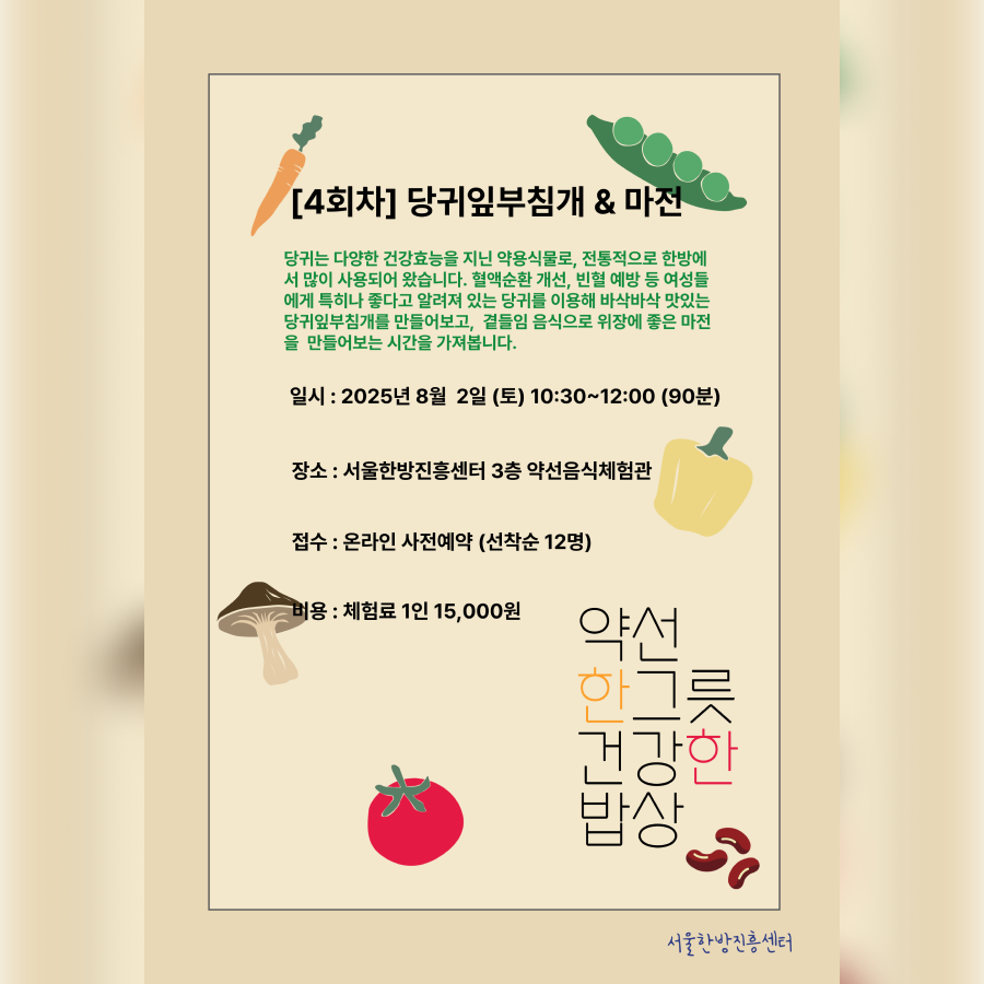 당귀는 혈액순환 개선과 빈혈 예방에 도움을 주어 특히 여성 건강에 유익한 재료로 알려져 있습니다. 이번 체험에서는 당귀를 주재료로 활용한 *‘당귀 부침개’*를 함께 만들어 볼 예정입니다.