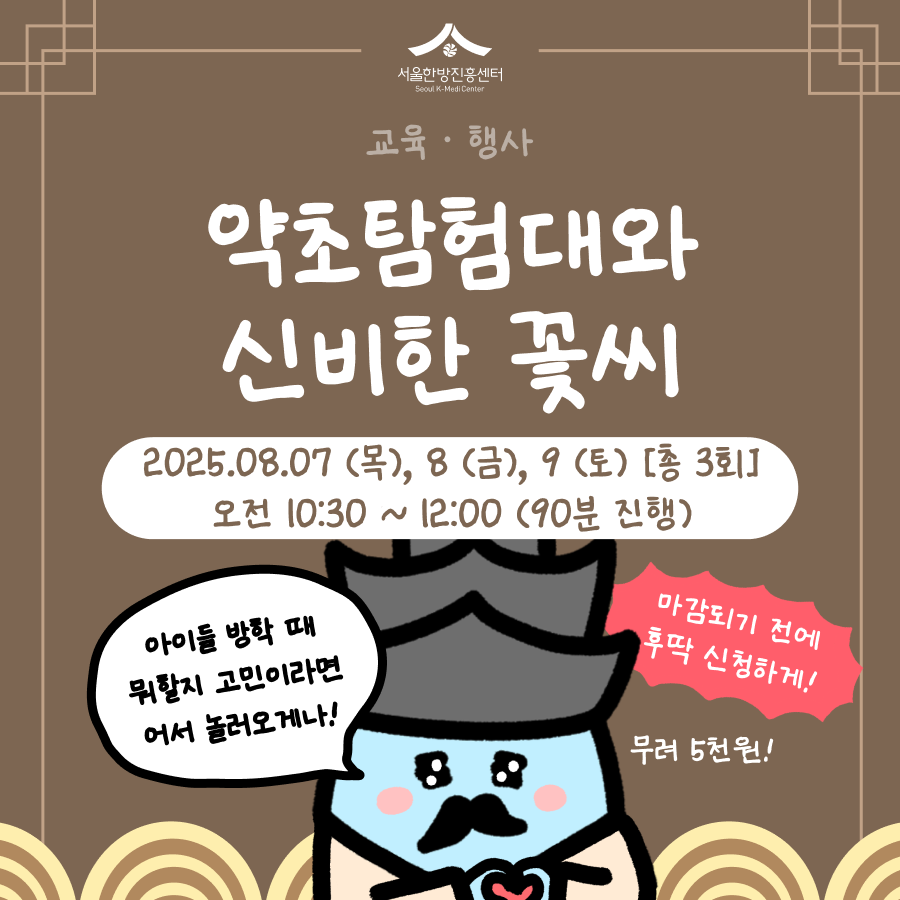 ![]() ![]() 여름방학을 맞이하여 자녀와 함께 유익한 시간을 보내고자 한다면, 서울한방진흥센터에서 진행하는 <약초탐험대와 신비한 꽃씨> 체험 프로그램에 참여해보시기 바랍니다.
