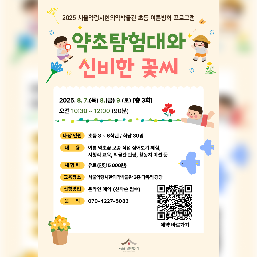 본 프로그램은 여름 약초꽃 모종 심기, 시청각 교육, 박물관 관람, 활동지 미션 등 아이들의 오감을 자극하고 학습과 재미를 동시에 경험할 수 있도록 구성되어 있습니다.