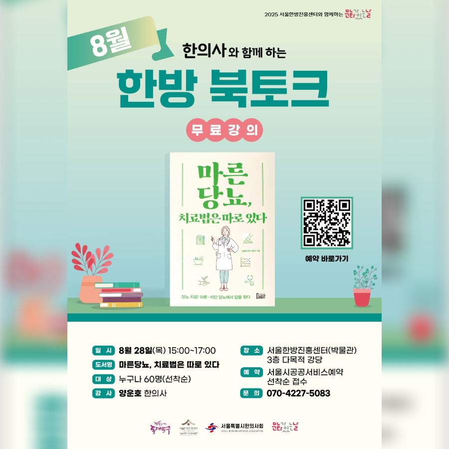 ? 일시 : 8월 28일(목) 오후 3시 ~ 5시 ? 장소 : 서울한방진흥센터 3층 다목적 강당 ? 신청 방법 : ‘서울시공공서비스예약’에서 선착순 접수 |