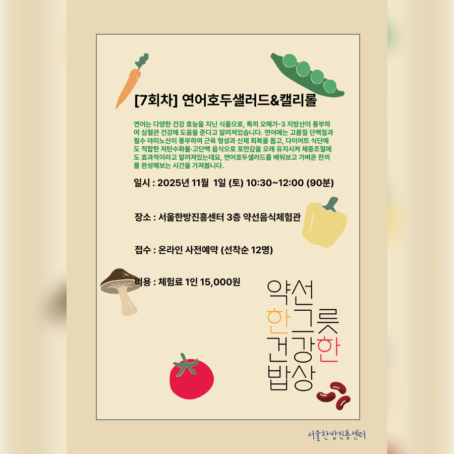 이번 체험에서는 신선한 연어와 고소한 호두의 조화가 돋보이는 연어호두샐러드, 그리고 색다른 풍미의 캘리롤을 직접 만들어보는 시간을 준비했습니다. ?✨