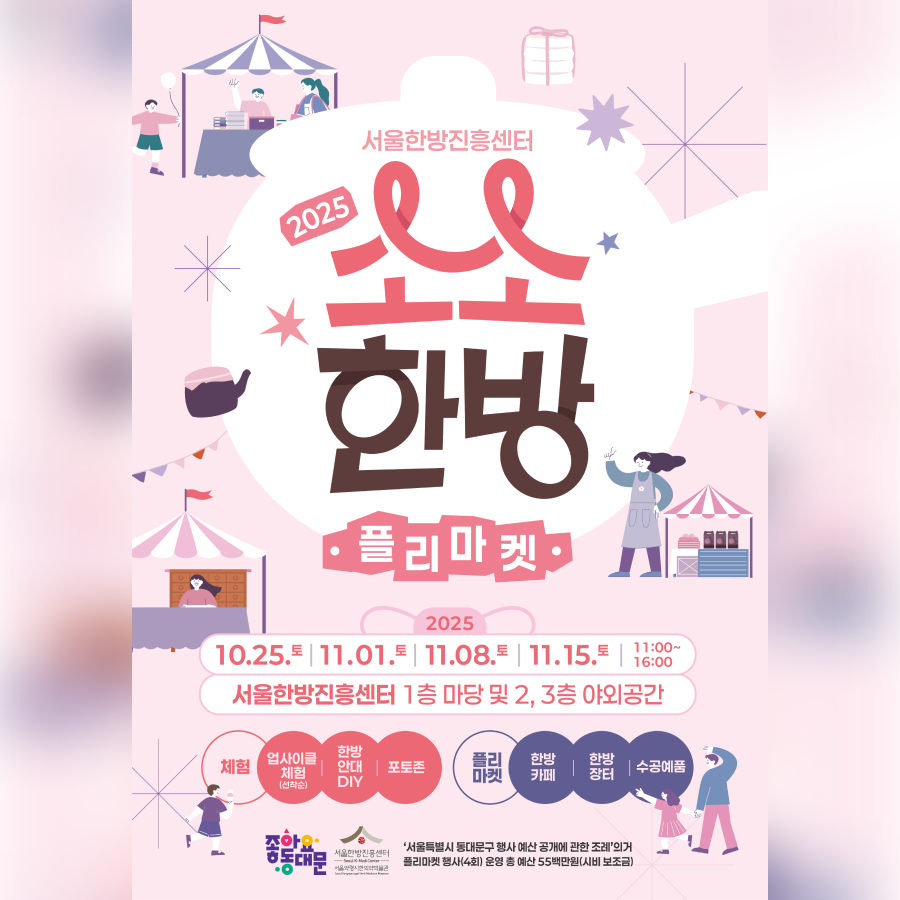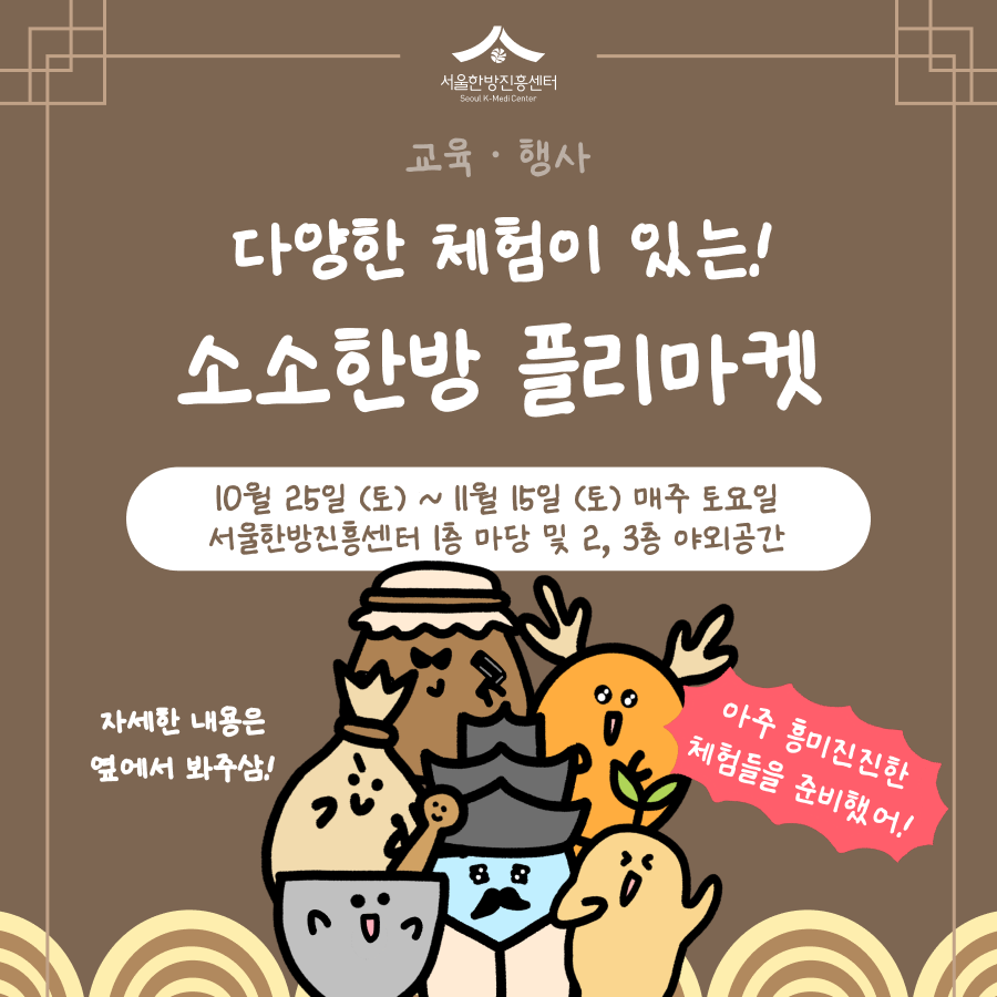 소소한방 플리마켓에 여러분을 초대합니다✨ 10월 25일(토)부터 11월 15일(토)까지 매주 토요일, 다채로운 체험과 함께하는 특별한 시간이 마련되어 있습니다?