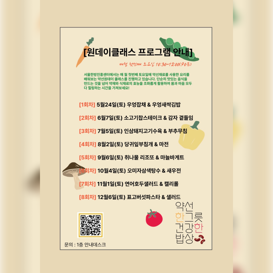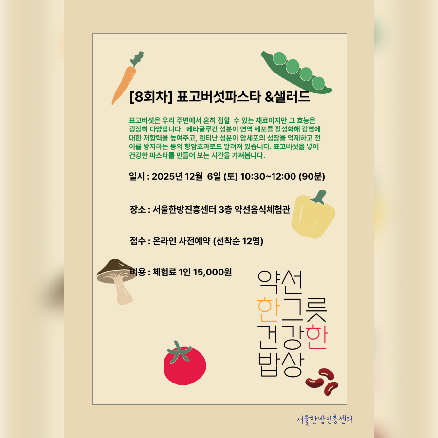 표고버섯의 풍미와 활용법을 깊이 있게 체험할 수 있는 표고버섯 파스타 & 샐러드 클래스가 조기 마감되었습니다. 이번 회차는 추가 모집이 어려우니, 다음달 프로그램은 미리 신청하여 참여 기회를 놓치지 않길 바랍니다.