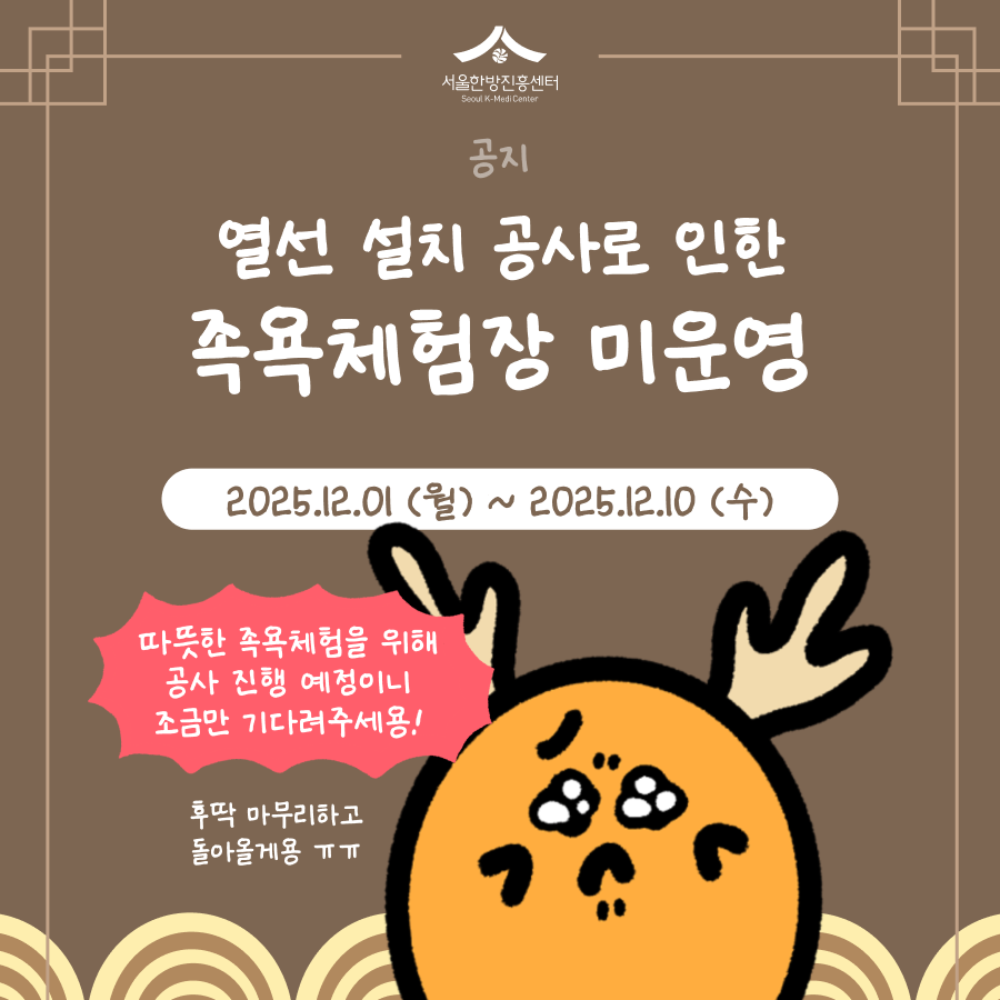![]() 족욕체험장 미운영 공지 12월 1일 (월) ~ 12월 10일 (수) 동안 열선 설치 공사가 진행될 예정입니다. 공사 기간 동안 이용에 불편을 드려 죄송하며, 더 나은 환경으로 다시 찾아뵙겠습니다. 감사합니다. |