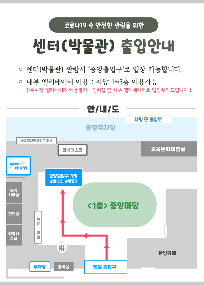 *센터 및 박물관 출입안내(일부입구폐쇄)* 1. 서울한방진흥센터 및 박물관은 <중앙출입구로>만 입장이 가능합니다. 2. 엘리베이터는 1~3층만 이용가능합니다.(경비실 옆 외부엘리베이터로 이동)