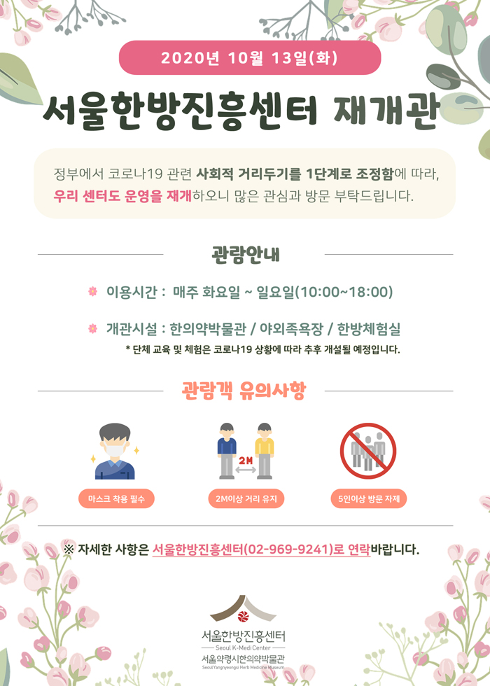 *관람 시 유의사항* 서울한방진흥센터 방문 시, 아래사항을 꼭 지켜주셔야합니다! 첫째, 마스크 착용 필수! 둘째, 2M 이상 거리 유지 셋째, 5인이상의 단체 방문 자제 +손세정제 사용하기, 손 깨끗히 씻기